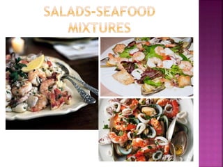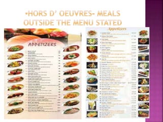 This document provides descriptions of various types of appetizers and hors d'oeuvres. It discusses 7 categories of appetizers including barbeque chicken bites, fries, meatballs, pickled items, raw vegetables, strawberry fruit dip, and fried tofu with soya. It also describes hors d'oeuvres, canapes, crudites, snacks, cheeses, sausages, dumplings, and bruschetta giving details on their composition and origins.