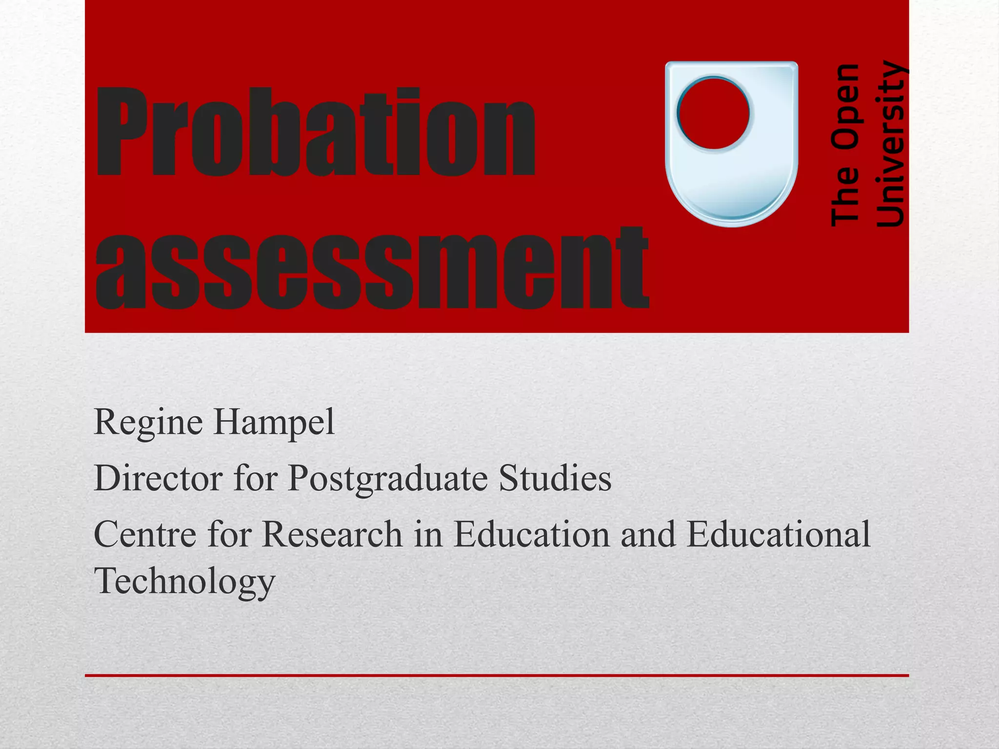 The document provides information about the probation assessment process for PhD students at the Centre for Research in Education and Educational Technology. It discusses the four main elements of probation assessment: 1) a project report, 2) a mini viva, 3) a summary of skills audit, and 4) an oral presentation. It also provides details about the content required for the project report, potential questions in the mini viva, and the three possible outcomes of the probation assessment: confirmation of PhD registration, requirement of further work, or termination of registration.
