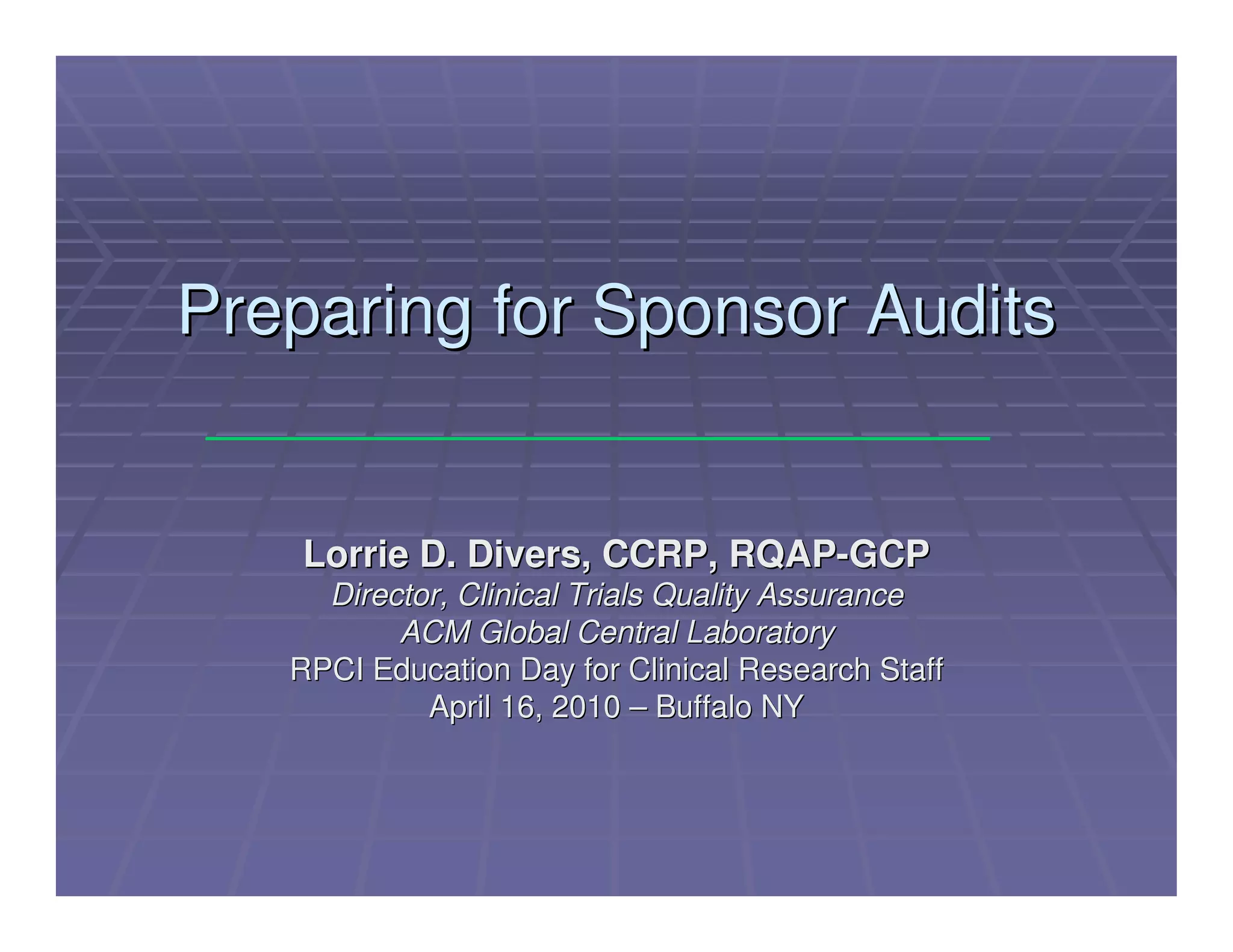 This document discusses preparing for sponsor audits of clinical trial sites. It explains that sponsors audit sites to ensure regulatory compliance, data integrity, and subject safety. The presentation covers why sponsors audit, what to expect during an audit, how to prepare, and how to respond to any observations or recommendations. The key points are to follow the protocol, document everything, make all necessary documents and staff available, be honest and transparent in responses, and see the audit as an opportunity for education rather than punishment.