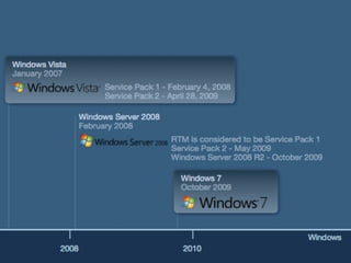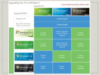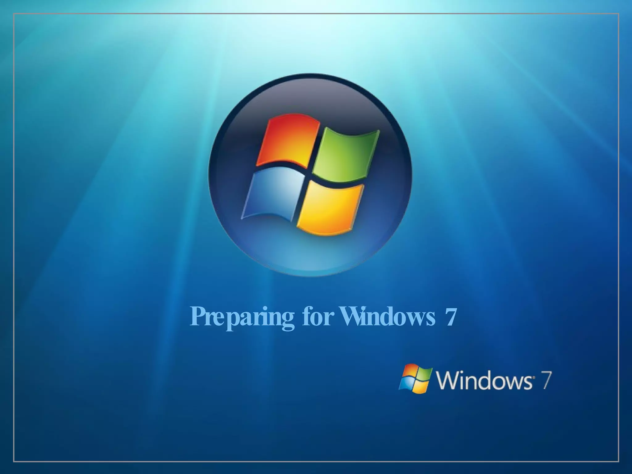 The document provides an overview and agenda for a presentation on preparing for Windows 7. It discusses the historical context of Windows operating systems in business, highlights new features and improvements in Windows 7, and outlines upgrade pathways and installation information for migrating to Windows 7. Performance tests show Windows 7 installations are faster than previous versions and utilize hardware resources more efficiently. Projections indicate high adoption rates for Windows 7 in business within 30 months of its September 2009 release.
