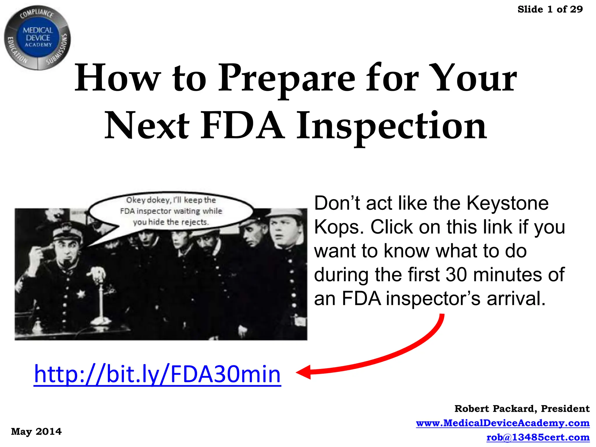 This document provides an overview of FDA inspections of medical device manufacturers. It discusses the FDA's risk-based approach to inspections and types of inspections. Key areas the FDA focuses on include CAPA, management review, internal audits, supplier audits, design controls, complaint handling and adverse event reporting. The document also provides tips on preparing for an inspection, what to expect during an inspection, potential inspection outcomes, and how to respond to FDA observations on Form 483.