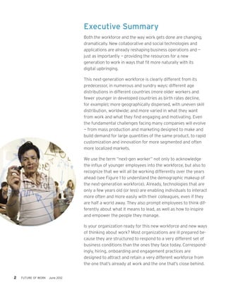 This document discusses how organizations need to prepare for the next generation workforce by changing their hiring, onboarding, and engagement practices. It notes that this next generation workforce has different characteristics than previous generations as they have grown up with new technologies. It argues organizations need to build a capacity for collaboration, both internally and externally, and leverage new technologies to improve performance. It provides examples of how some companies have successfully adapted their practices to engage this new workforce.