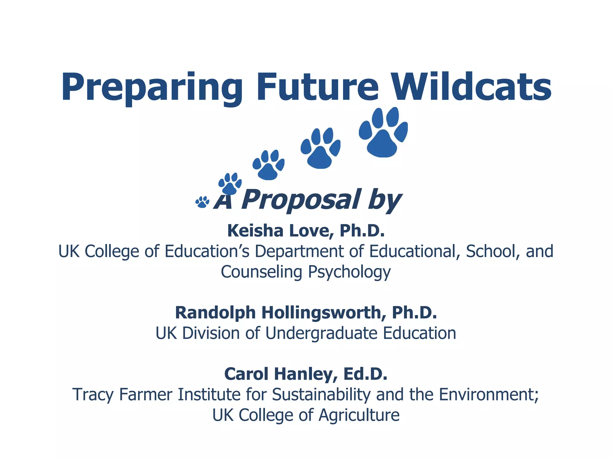 The document outlines a proposal by Keisha Love and others to address low and declining undergraduate enrollment from Kentucky's most rural counties at the University of Kentucky. The 'Preparing Future Wildcats' program aims to increase high school graduation, university applications, and graduation rates through community partnerships and targeted recruitment strategies for motivated students. The initiative requires a budget of $15 million and seeks to develop innovative practices in education and student support.