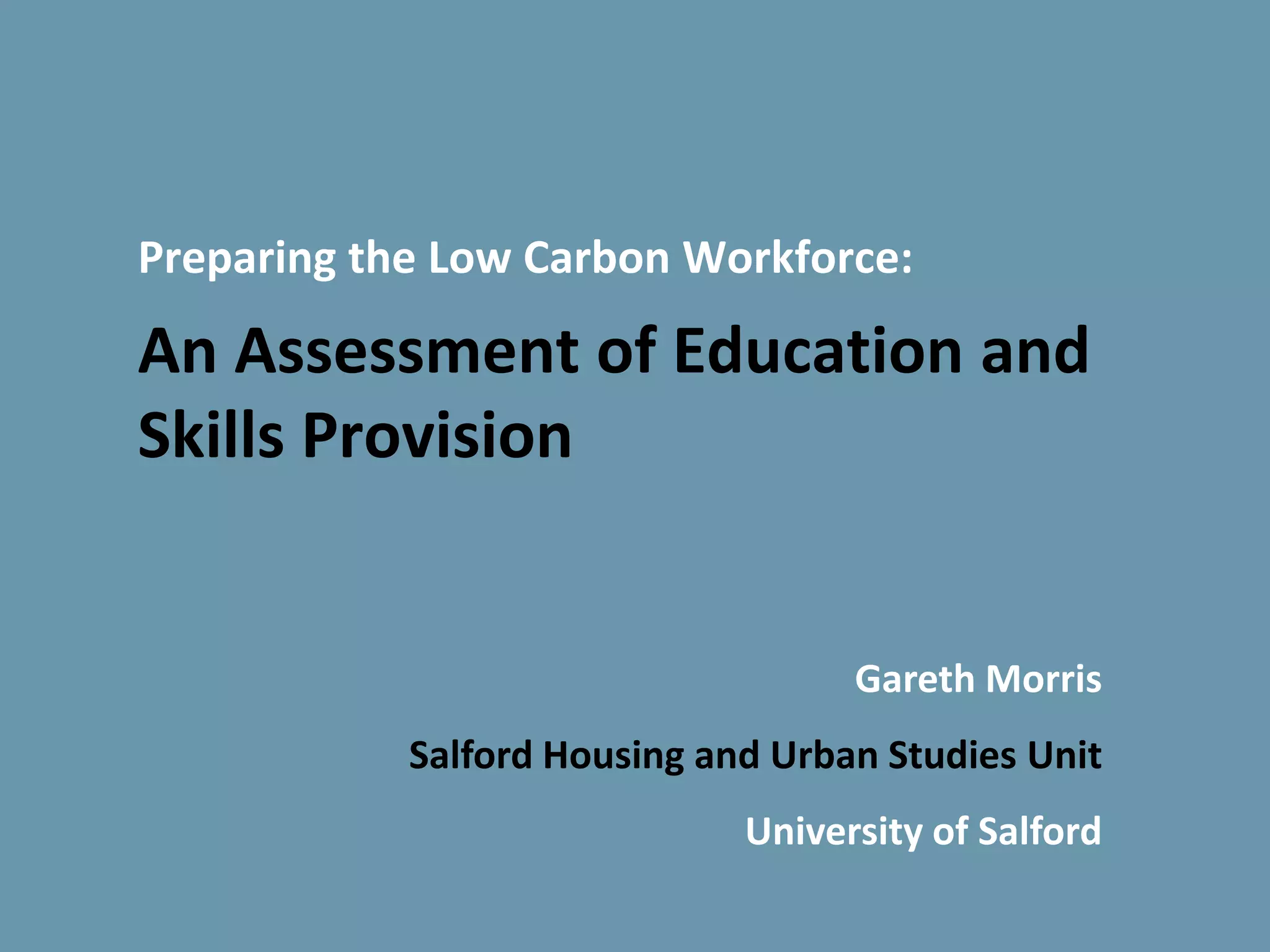 The document discusses preparing the workforce for jobs in the growing low carbon economy. It outlines that the UK aims to reduce greenhouse gas emissions by 80% by 2050 to mitigate climate change. This low carbon transition is expected to create many new green jobs in areas like renewable energy, energy efficiency retrofits, and low carbon product manufacturing and exports. However, a skilled workforce must be developed through the education and training system. The document reviews current low carbon education and skills programs in UK universities and colleges, and identifies gaps that must be addressed to fully realize the low carbon economic opportunity.