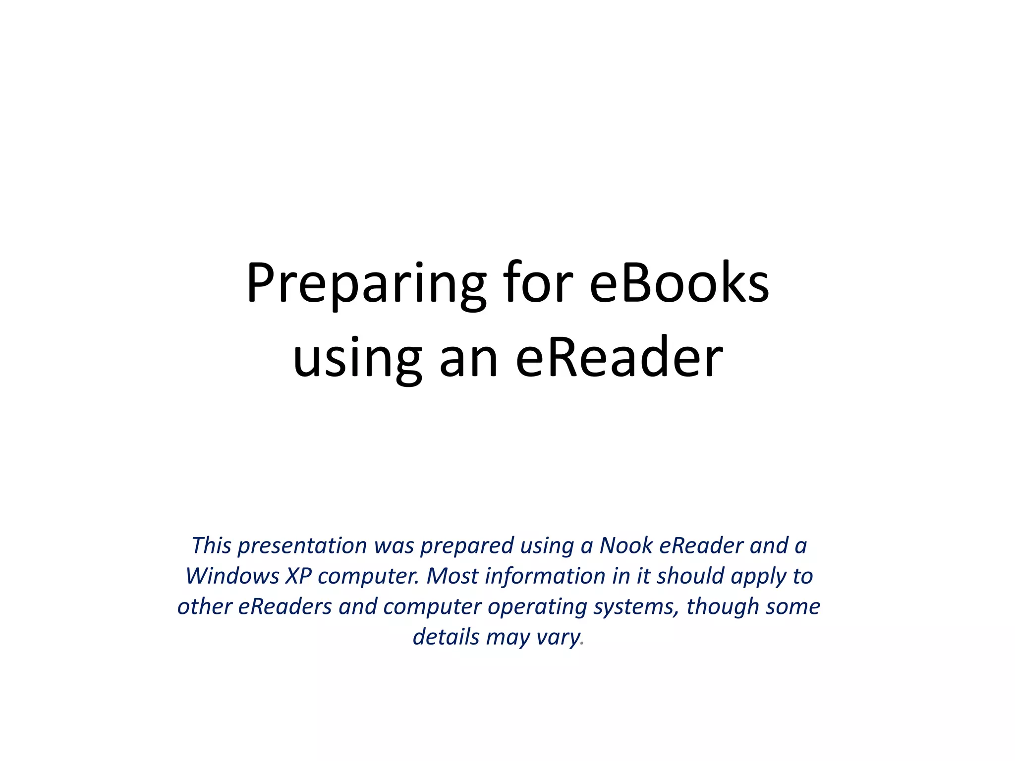 This document provides instructions for downloading eBooks from the library using an eReader device. It outlines the steps to register an eReader with Adobe Digital Editions software, search the library catalog for eBooks, check out and download titles, and transfer books to the eReader for reading. The process involves setting up an Adobe ID, plugging the eReader into the computer, searching the library website, entering a library card number, downloading titles using Adobe Digital Editions, and dragging books from the computer to the authorized eReader bookshelf.