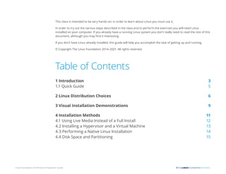 This document provides guidance on preparing a computer for Linux training by discussing installation methods. It recommends either installing Linux in a virtual machine using free hypervisor software like VirtualBox to avoid complex disk partitioning issues. Alternatively, it describes using live media which allows testing hardware compatibility without installing but has performance limitations. It also outlines performing a native installation and concerns around disk space and partitioning for multi-boot systems.