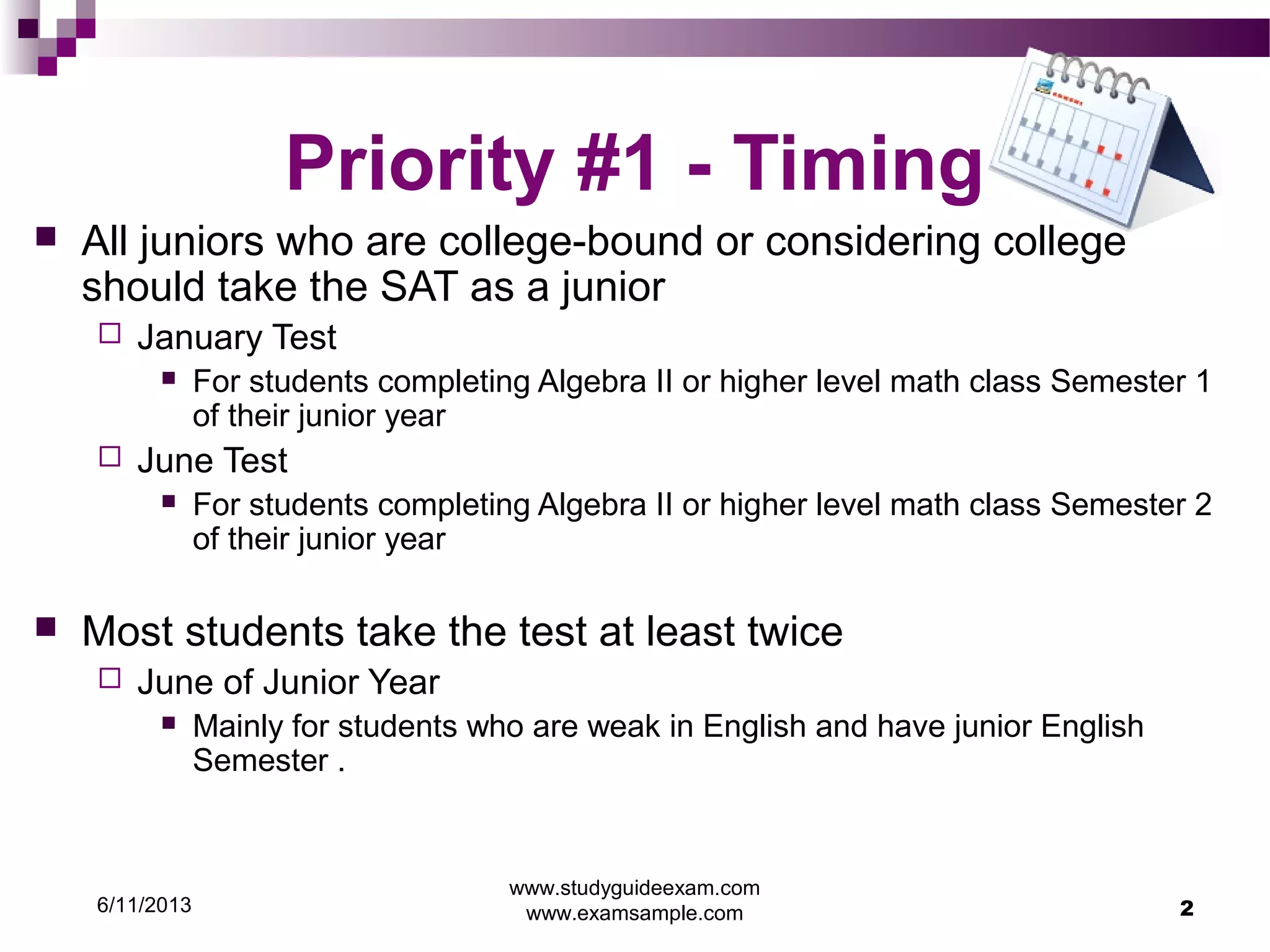 This document provides a comprehensive guide for SAT exam preparation, emphasizing the importance of timing, rigorous coursework, and utilizing practice resources such as the PSAT. It highlights strategies for increasing scores through retakes and preparation sessions, along with suggestions for at-home study and available prep classes. Additionally, the scoring system and test structure are explained to aid students in their preparations.
