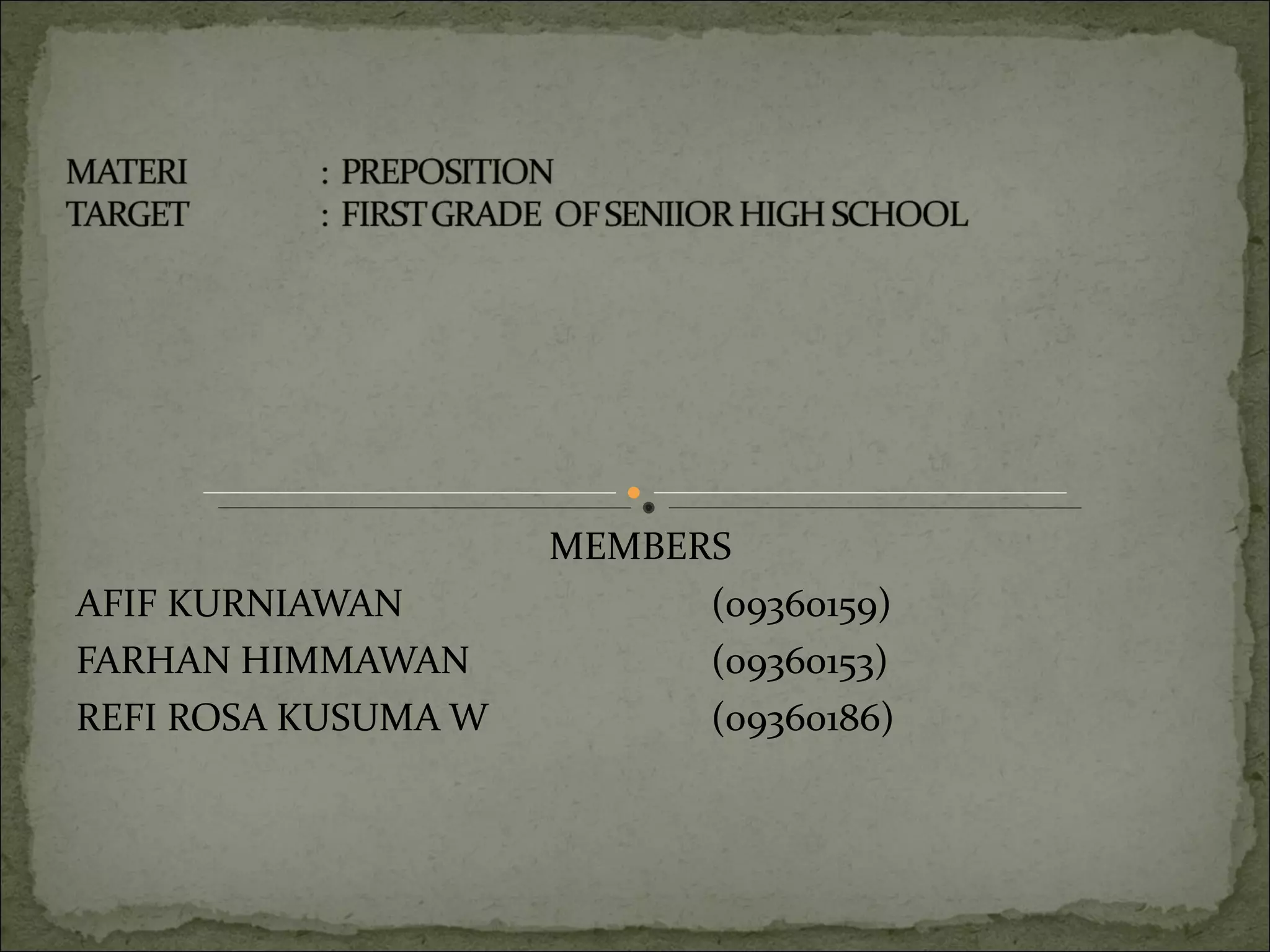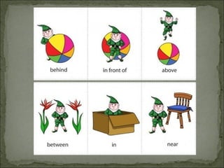 This document discusses prepositions in English and provides examples of their use. It begins with a conversation where a hat is found "on" someone's head. It then defines preposition as an English part of speech. Examples of basic and common prepositions like "on", "under", and "near" are given. An exercise follows with sentences using these prepositions. The document concludes with thanks for the reader's attention in learning about prepositions.