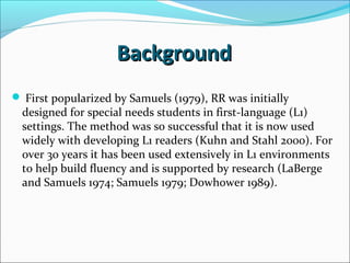 The document discusses techniques for using repeated reading (RR) to improve reading fluency in a second language classroom. It describes three techniques: 1) classic oral repeated reading, where students read text chunks out loud multiple times; 2) paired repeated reading, where students take turns reading to each other; and 3) reader's theater, where students rehearse and perform scripts. It provides suggestions for implementing each technique, such as modeling fluent reading, dividing texts into chunks, and having students focus on pronunciation. The conclusion emphasizes that RR techniques like oral reading can help less fluent L2 readers improve their decoding, fluency, accuracy and comprehension.