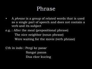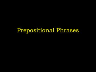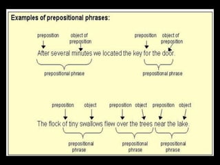 The document explains prepositional phrases, which are groups of words that include a preposition and an object, serving as adjectives or adverbs in sentences. It provides examples distinguishing adjective phrases, which modify nouns, from adverb phrases, which modify verbs or adjectives. Additionally, it includes an assignment for rewriting sentences to identify and classify prepositional phrases.