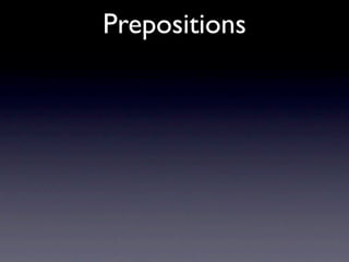 The document defines prepositions as words that relate nouns or pronouns to the rest of a sentence. It provides examples of how prepositions can indicate time, direction, location, and relationships. Specifically, it gives sample sentences demonstrating the use of common prepositions like before, after, up, down, beside, in front of, with, for, from, and except.