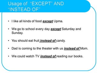 Prepositions are words that indicate location, direction, time, or other relationships between nouns. There are simple one-word prepositions like "in" and "on" as well as compound prepositions with multiple words like "instead of". Prepositions can be categorized as prepositions of place, which show where something happens; prepositions of time, which show when something happens; or prepositions of direction, which show where something is going. Examples are provided for each category of preposition.
