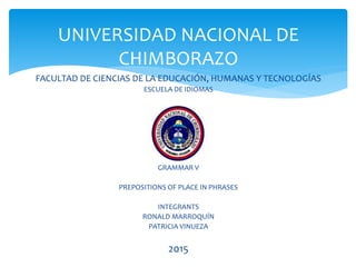 This document discusses the use of prepositions of place in phrases. It explains that prepositions such as "at", "on", and "in" are used to indicate where something is located. Specific uses of each preposition are outlined, such as "at" indicating a specific place, "on" indicating position on a surface or street, and "in" indicating being enclosed or within a larger area. Examples are provided for each preposition. The document concludes with exercises for learners to practice using these prepositions of place correctly in sentences.
