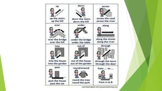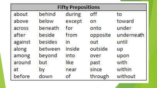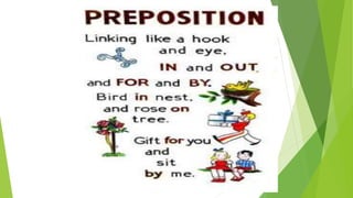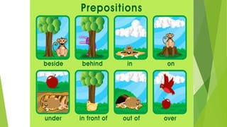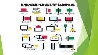 This document provides an overview of prepositions and prepositional phrases. It defines prepositions as words that connect nouns, pronouns, and phrases and indicate their relationship in terms of time, place, direction, etc. The document then discusses different types of prepositions including those for time (in, on, at), place (in, on, at), direction (to, toward, through, into), agent (by), and instrument (by, with). Examples are provided for each. It also defines prepositional phrases as groups of words consisting of a preposition and its object, functioning as adjectives or adverbs. Exercises are included for learners to practice identifying prepositions and prepositional phrases.