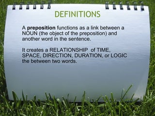 The document discusses prepositions, which are words that indicate a relationship between nouns or pronouns in a sentence. Prepositions show relationships of time, space, direction, duration or logic. Common prepositions include "about", "above", "across", and "after". Prepositions function to link a noun as the object of the preposition to another word. Examples are provided such as "The book is on the table" and "She read the book during class".