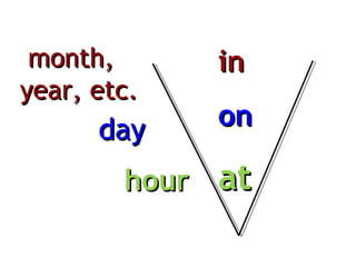 This document provides instruction on using the prepositions "at", "on", and "in" to indicate specific times and periods of time in English. It explains that "at" is used to refer to specific times on the clock or expressions like "at night". "On" is used for days of the week, specific dates, or periods like "on the weekend". "In" refers to longer periods like months, seasons, or parts of the day like "in the morning". Examples are given for the different uses of each preposition.