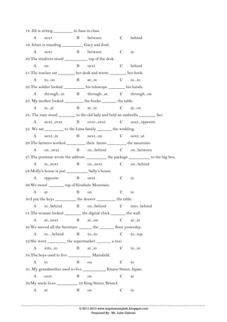 This document contains a grammar practice test on prepositions. It consists of 50 multiple choice questions testing understanding of different English prepositions and their usage in various contexts such as location, time, and motion. The questions are followed by the answers. The purpose is to help learners practice and improve their knowledge of prepositions.