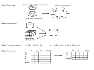 This document provides an overview of key concepts in data preprocessing for data science. It discusses why preprocessing is important due to issues with real-world data being dirty, incomplete, noisy or inconsistent. The major tasks covered are data cleaning (handling missing data, outliers, inconsistencies), data integration, transformation (normalization, aggregation), and reduction (discretization, dimensionality reduction). Clustering and regression techniques are also introduced for handling outliers and smoothing noisy data. The goal of preprocessing is to prepare raw data into a format suitable for analysis to obtain quality insights and predictions.