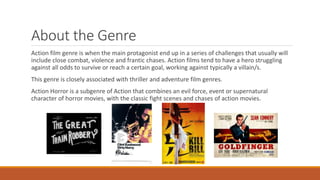 This document provides an overview of the action genre of film. It discusses the typical plot elements involving a hero struggling against adversity to reach a goal while facing off against a villain. A brief history is given of how the genre evolved from early swashbuckling films and westerns to include war films, spy thrillers, urban crime films, martial arts films, and the rise of CGI effects. Some of the most influential directors and actors in action films are listed, such as Steven Spielberg, Quentin Tarantino, Bruce Willis, and Arnold Schwarzenegger. A typical 5-act structure for action movie plots is outlined. Finally, some major awards for action films are named.