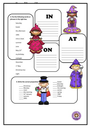 This document provides examples of using prepositions of time such as "on", "in", and "at" correctly with dates, days, times and seasons. It gives sentences to choose the right preposition for and blanks to fill in with the correct preposition. There are also exercises to sort words and phrases into categories of "on", "in", or "at" and fill in blanks with the appropriate preposition of time. The document aims to help practice and test understanding of using prepositions of time correctly in context.