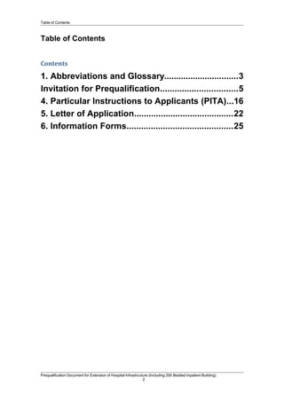This document provides information for contractors interested in prequalifying for the extension of infrastructure at the B.P. Koirala Memorial Cancer Hospital in Chitwan, Nepal. It includes 200+ pages with details on the project scope, prequalification process, evaluation criteria, and requirements. Key information includes: