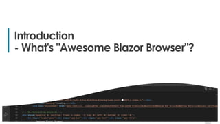 The document discusses the creation of the 'awesome blazor browser', a dedicated Blazor WebAssembly app for browsing the GitHub repository of 'awesome blazor'. It highlights the challenges faced in improving search engine indexing of the app's content and proposes a solution using the 'blazorwasmprerendering.build' NuGet package for server-side pre-rendering. The package simplifies the pre-rendering process, improving search results with minimal code change, although it is still in an experimental phase.