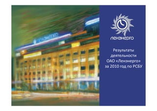 Презентация ОАО 'Ленэнерго' за 2010 год содержит ключевые результаты деятельности компании, включая рост выручки на 31,1% по сравнению с предыдущим годом и улучшение показателей EBITDA. В документе также упоминаются прогнозные заявления, которые подвержены рискам и неопределенностям, и предостерегается от полагания на эти прогнозы. Отчет включает данные о технологиях, указывая на увеличение заявок на технологическое присоединение и снижение потерь электроэнергии.