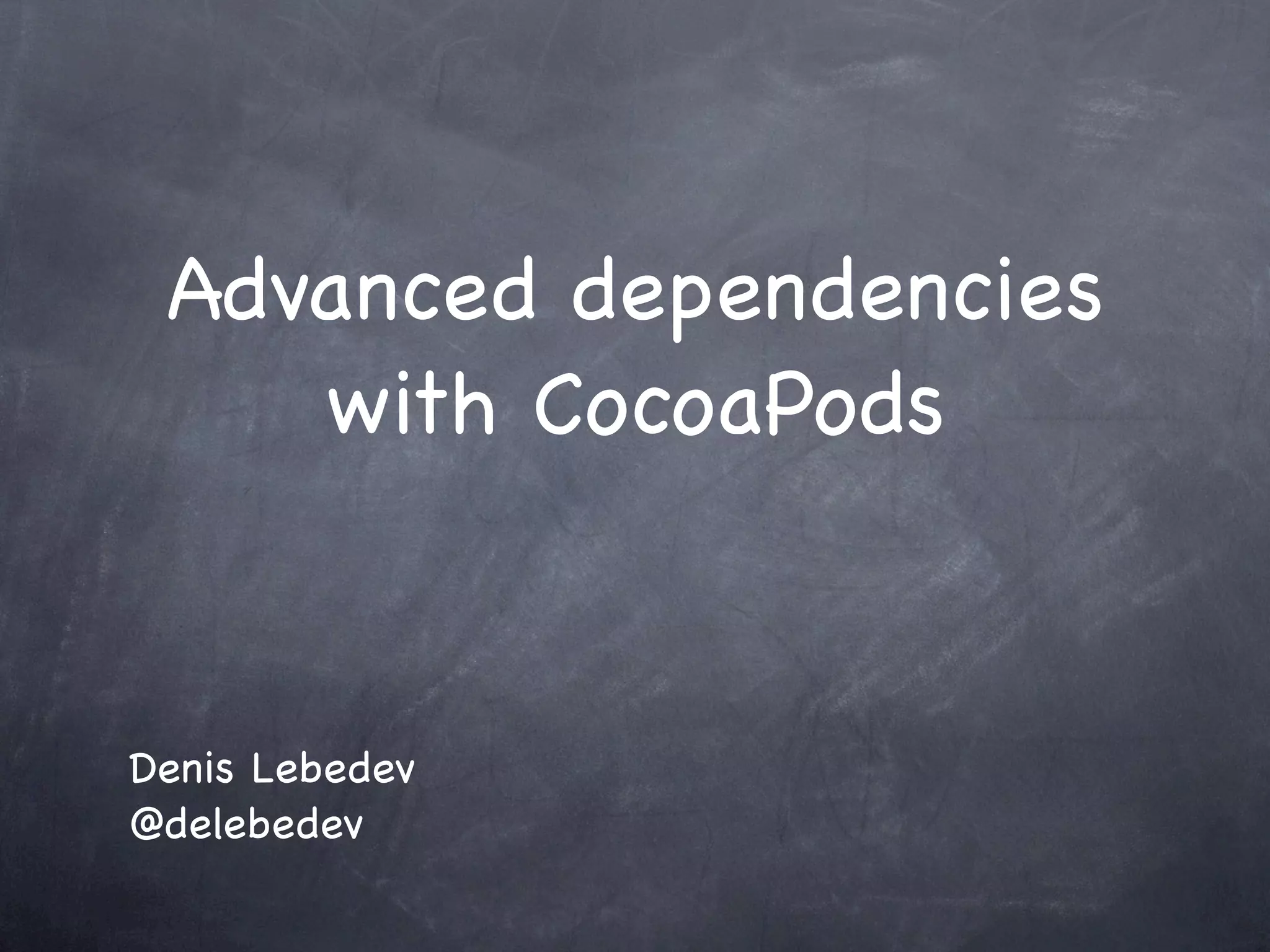 This document discusses CocoaPods, an open-source dependency manager for Cocoa projects like iOS and OS X apps. It explains how to install and use CocoaPods to manage third-party library dependencies through a Podfile. Key features covered include creating and contributing podspecs to define libraries, versioning, targeting multiple configurations, and sharing specifications through public or private spec repositories.