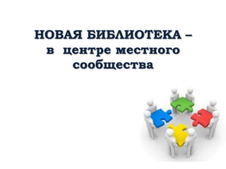 Документ обсуждает роль библиотек как 'третьих мест' в местном сообществе, где люди могут взаимодействовать, отдыхать и развивать социальные связи. Он подчеркивает значимость библиотек в условиях современного общества, включая изменения в образе жизни и использованию технологий, а также их возможность стать инкубаторами идей и агентами местного развития. Библиотеки должны адаптироваться к новым требованиям и стать центрами управления знаниями и эмоциями в своем сообществе.