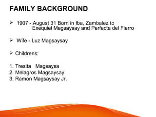 Ramon Magsaysay was the seventh president of the Philippines, serving from 1953 to 1957. He was born in 1907 in Iba, Zambales and graduated from Jose Rizal College with a degree in commerce. During World War II, he led guerrilla forces against the Japanese occupation. After the war, he was elected to Congress and later appointed Secretary of National Defense. Elected president in 1953 as a reform candidate, his initiatives included land reform, fighting corruption, and establishing collective defense agreements. However, his presidency was cut short when he tragically died in a plane crash in 1957 at the age of 49.