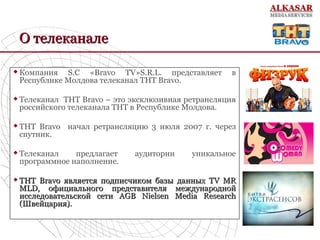 Телеканал 'ТНТ Bravo' представляет собой эксклюзивную ретрансляцию российского телеканала ТНТ в Республике Молдова с начала вещания 3 июля 2007 года. Он предлагает уникальное программное содержание и доступен через спутниковые и кабельные сети, охватывающие более 80 операторов в стране. По состоянию на 2014 год, аудитория телеканала преимущественно молодежная и активная, с характерными показателями рейтингов и доли рынка.