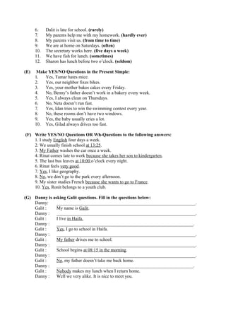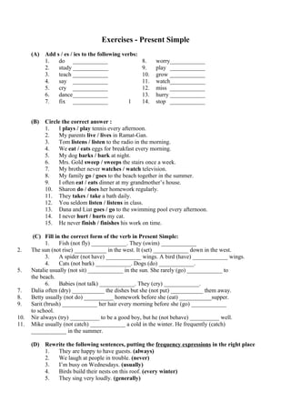 This document provides exercises on using verbs in the present simple and present progressive tenses in English. It includes filling in verbs, circling correct verbs, answering yes/no and wh- questions, and rewriting sentences with frequency adverbs in the right places. The exercises cover a range of grammar points including regular and irregular verbs, questions forms, time expressions, and the differences between the simple present and present progressive tenses.