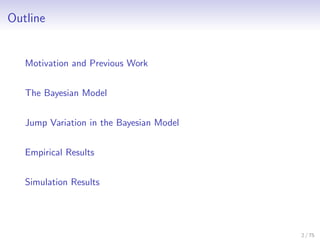 This document outlines a Bayesian model for estimating jump variation in high-frequency asset returns. It begins with background on high-frequency financial data and models jump variation as the sum of squared scaled interval jumps. The continuous jump-diffusion model is reduced to a discrete model where log-returns are modeled as scaled stochastic volatility plus scaled jumps. A Bayesian model is then developed where jumps are modeled with a mixture prior and posterior distributions are derived. Estimation involves calculating posterior jump probabilities and densities. Simulation results demonstrate the model can estimate jump variation.