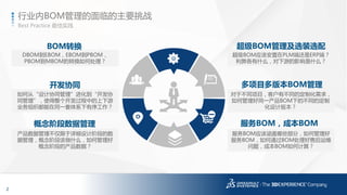 本文档介绍了达索系统的BOM管理解决方案,聚焦于行业内BOM管理面临的主要挑战及最佳实践。核心思想包括建立企业级BOM架构、项目阶段与BOM的关联,以及基于BOM架构的协同流程。文中还探讨了多版本BOM管理、服务BOM和成本BOM等方面,旨在优化产品开发过程中数据管理与协同。