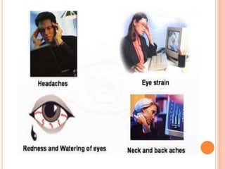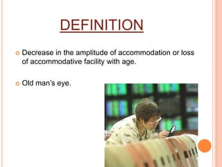 Presbyopia is a natural part of the aging process where the eye's ability to focus on nearby objects decreases, requiring reading material to be held farther away. It results from a loss of accommodative amplitude and facility. Symptoms include blurred near vision, headaches, and fatigue when doing close work. Presbyopia is diagnosed through visual acuity and refraction tests and treated with reading glasses or contact lenses, and in some cases refractive surgery like monovision LASIK or lens replacement.