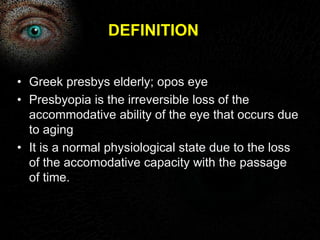 Presbyopia is the loss of accommodation ability that occurs with aging. It results from a loss of elasticity in the lens and ciliary muscles. By age 40-45, most people experience difficulty seeing objects close up. Symptoms include problems with near vision that are worse in low light. It is diagnosed by reduced amplitude of accommodation. Treatment involves using reading glasses, bifocals, or progressive lenses to add the needed optical power for near vision. Multifocal contact lenses and refractive surgery can also help treat presbyopia.