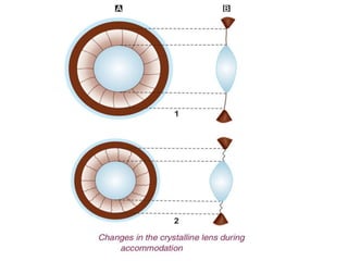 This document discusses presbyopia, an age-related condition characterized by a loss of ability to focus on near objects. It defines key terms like accommodation, near and far points. Presbyopia is caused by hardening of the lens and decreased elasticity of lens fibers with age. Symptoms include difficulty with near vision. Presbyopia treatment involves prescribing convex lenses matched to the patient's age to allow clear near vision. Multifocal lenses can provide both distance and near correction.
