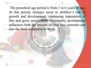 The document discusses nutrition in preschool children ages 1-6. Key points include: