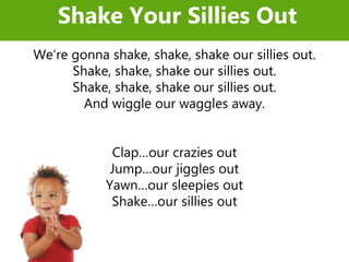 This document outlines the activities and schedule for a preschool storytime session. It includes songs like "Shake Your Sillies Out" and "Teddy Bear" to get children engaged. Early literacy tips are provided, such as discussing print awareness. Books like "Bedtime Bonnet" are read. The session ends with interactive songs and dances like "The Elmo Slide" to keep children moving and having fun.