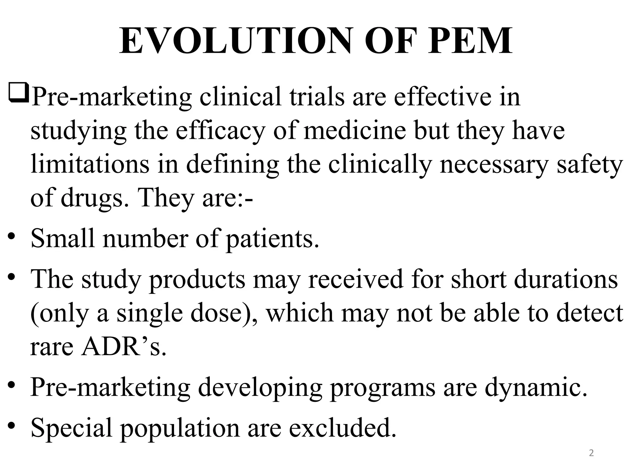 - While PEM provides nationally representative data on new drugs in real-world settings, it also has disadvantages like an inability to measure compliance or determine use of non-prescription medications.