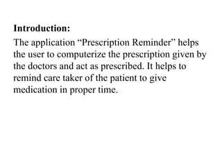 This document summarizes a prescription reminder application that allows users to enter prescription details from doctors and set reminders to ensure medications are taken on schedule. The application stores patient and drug information in databases and uses reminders to alert caretakers when it's time to administer medications. The goal is to help patients recover faster through consistent intake of their prescribed drugs.