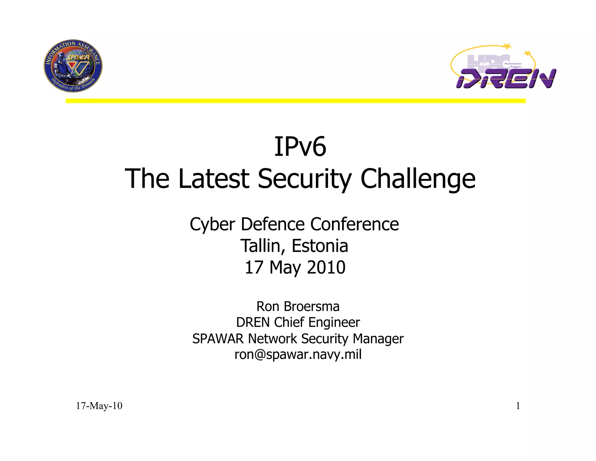 The document discusses IPv6 and its implementation across the Defense Research and Engineering Network (DREN). It provides a brief introduction to IPv6, noting its vast address space and other benefits. It describes DREN's dual stack implementation approach and some security challenges introduced by IPv6, such as vulnerabilities in new implementations and issues with privacy addresses. The document recommends deploying IPv6 now rather than waiting for a crisis scenario due to IPv4 address depletion.