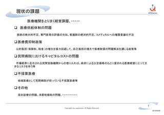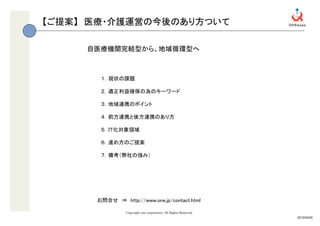 医療・介護運営の今後のあり方ついての提案資料 テーマ「自医療機関完結型から、地域循環型へ」 1.現状の課題 2.適正利益確保の為のキーワード 3.地域連携のポイント 4.前方連携と後方連携のあり方 5.IT化対象領域 6.進め方のご提案 7.備考(弊社の強み)