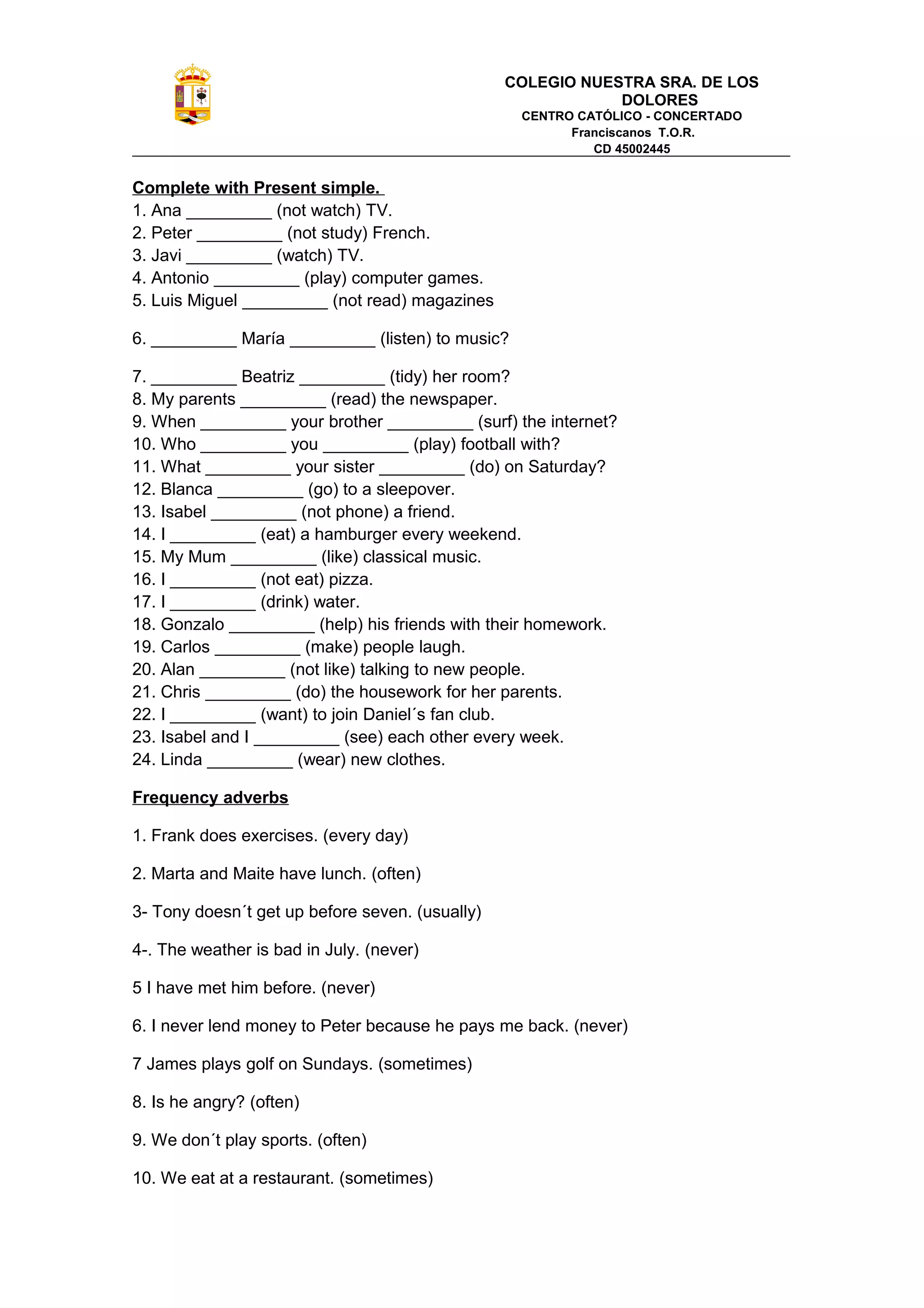 This document contains two exercises involving the present simple tense in English. The first exercise asks the student to complete 10 sentences by filling in the third person singular form of the verb in parentheses. The second exercise asks the student to complete 10 sentences using frequency adverbs such as "always", "never", "sometimes", etc. The document provides context and instruction for the student to practice forming sentences in the present simple tense in English.