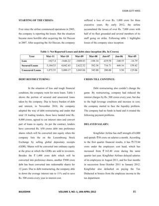 Kingfisher Airlines has been facing severe financial issues for many years, accumulating losses of over Rs. 7,000 crore with half of its fleet grounded. It has struggled with paying employee salaries, fuel dues, aircraft lease rentals, service tax dues, and bank loans. While debt restructuring provided some relief, high leverage and costs have led to continued liquidity problems. By early 2012, the airline's market share dropped to fifth largest as most of its flights were cancelled due to lack of funds. Kingfisher is on the brink of collapse unless an urgent solution is found to address its financial crisis.