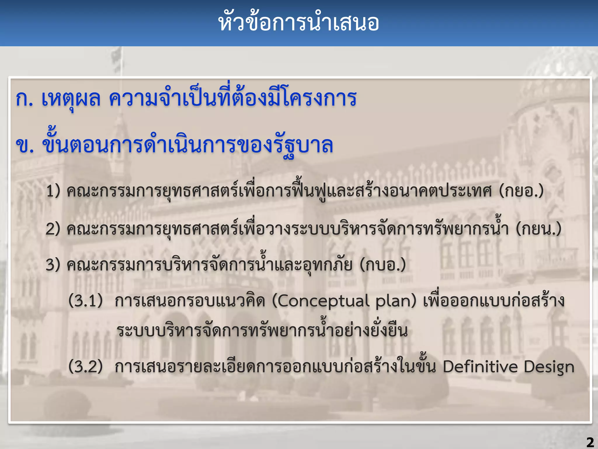 āļāļąāđāļāļāļāļāļāļģāļĢāļāđāļģāđāļāļīāļāļāļģāļĢāļāļāļāļĢāļąāļāļāļģāļĨ 1) āļāļāļ°āļāļĢāļĢāļĄāļāļģāļĢāļĒāļļāļāļāļĻāļģāļŠāļāļĢāđāđāļāļ·āđāļāļāļģāļĢāļāļ·āđāļāļāļđāđāļĨāļ°āļŠāļĢāđāļģāļāļāļāļģāļāļāļāļĢāļ°āđāļāļĻ (āļāļĒāļ.) 2) āļāļāļ°āļāļĢāļĢāļĄāļāļģāļĢāļĒāļļāļāļāļĻāļģāļŠāļāļĢāđāđāļāļ·āđāļāļ§āļģāļāļĢāļ°āļāļāļāļĢāļīāļŦāļģāļĢāļāļąāļāļāļģāļĢāļāļĢāļąāļāļĒāļģāļāļĢāļāđāđāļģ (āļāļĒāļ.) 3) āļāļāļ°āļāļĢāļĢāļĄāļāļģāļĢāļāļĢāļīāļŦāļģāļĢāļāļąāļāļāļģāļĢāļāđāđāļģāđāļĨāļ°āļāļļāļāļāļ āļąāļĒ (āļāļāļ.) (3.1) āļāļģāļĢāđāļŠāļāļāļāļĢāļāļāđāļāļ§āļāļīāļ (Conceptual plan) āđāļāļ·āđāļāļāļāļāđāļāļāļāđāļāļŠāļĢāđāļģāļ āļĢāļ°āļāļāļāļĢāļīāļŦāļģāļĢāļāļąāļāļāļģāļĢāļāļĢāļąāļāļĒāļģāļāļĢāļāđāđāļģāļāļĒāđāļģāļāļĒāļąāđāļāļĒāļ·āļ (3.2) āļāļģāļĢāđāļŠāļāļāļĢāļģāļĒāļĨāļ°āđāļāļĩāļĒāļāļāļģāļĢāļāļāļāđāļāļāļāđāļāļŠāļĢāđāļģāļāđāļāļāļąāđāļ Definitive Design 2