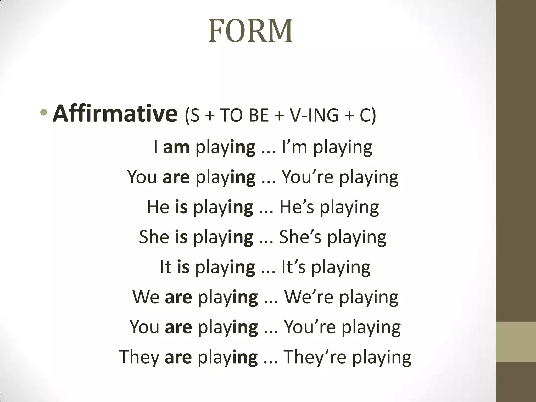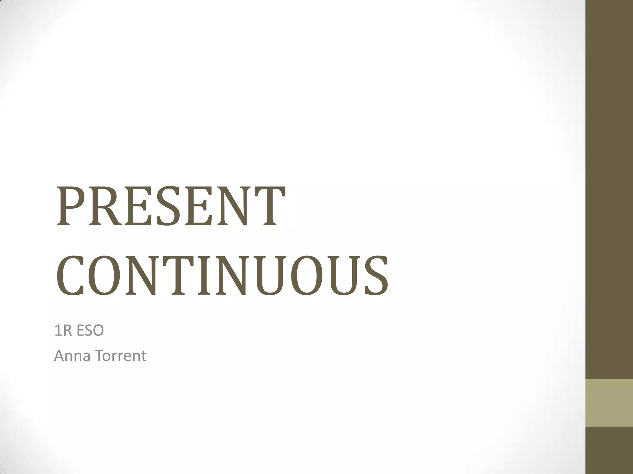 The document provides information about forming and using the present continuous tense in English. It lists the affirmative, negative, and interrogative forms using the verbs "to be" and "V-ing". Examples are given for each person (I, you, he, she, it, we, they). The uses of the present continuous are described as actions occurring at the moment of speaking and examples with time expressions like "now" and "at the moment" are given. Spelling rules for adding "-ing" are listed along with an exception for stative verbs like "think" and "want".