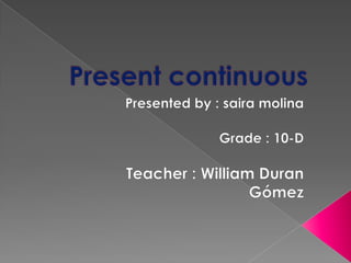 The present continuous tense is used to describe actions that are happening now or ongoing at the time of speaking. It is formed by using the present tense of the verb "to be" along with the verb's gerund (verb + "ing") form. Examples are provided of affirmative sentences using present continuous tense with subjects like "they", "he", and "I" along with example negative and interrogative sentences.