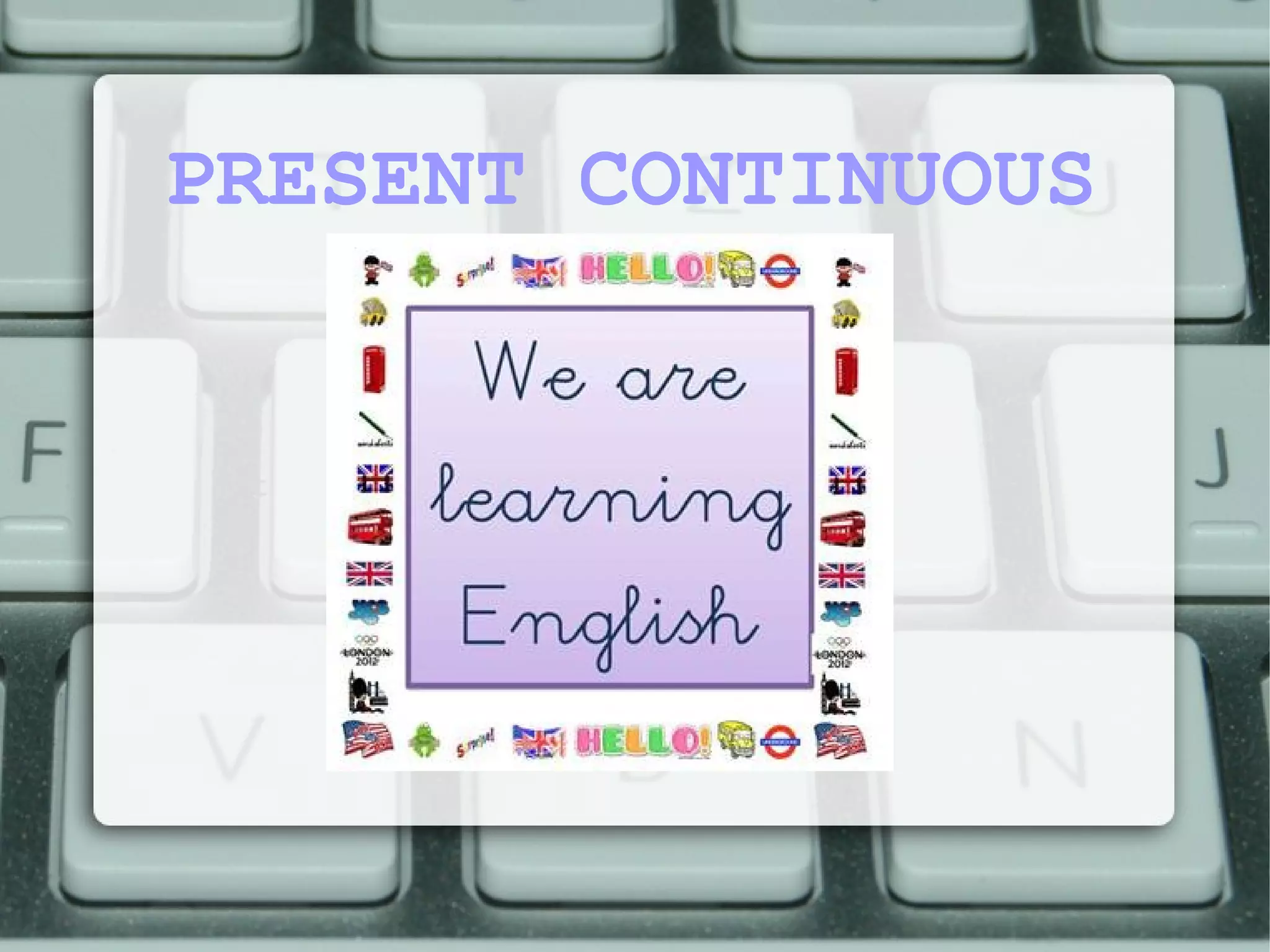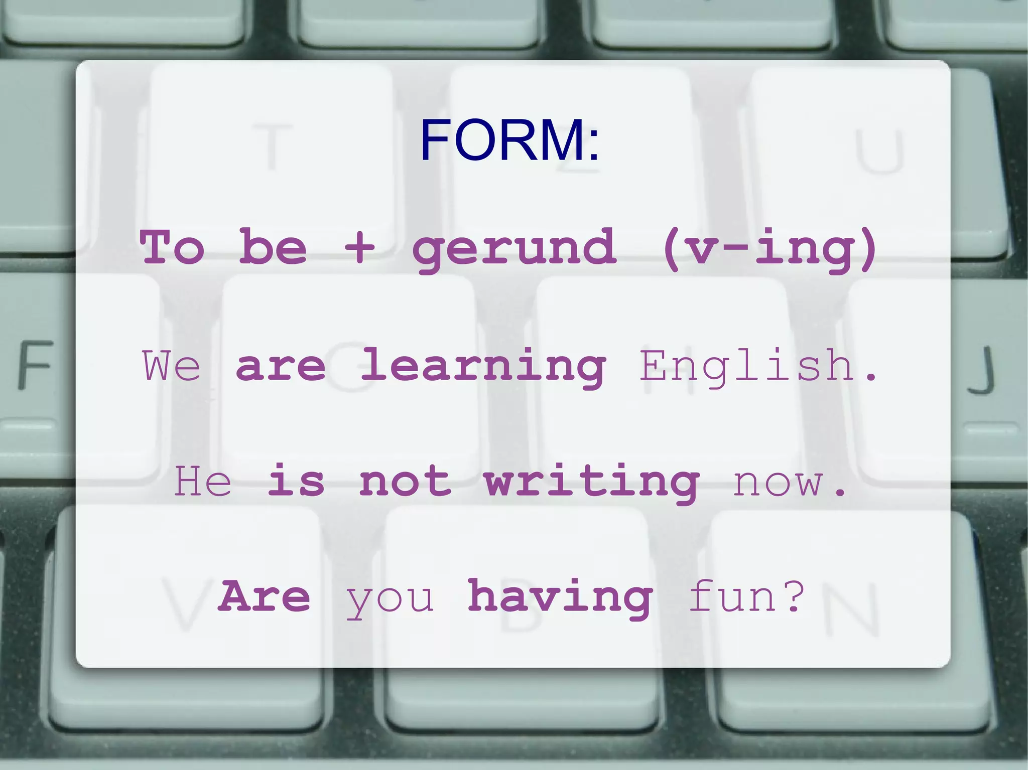 The document describes the present continuous tense in English. It provides the form as "to be + gerund (v-ing)" and gives examples. It explains the present continuous is used to talk about actions happening now, temporary actions, or future arrangements based on plans. The document concludes by asking the reader to practice identifying present continuous actions in pictures.