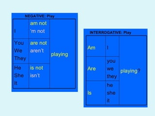The document discusses how to form and use the present continuous tense in English. The present continuous is formed using the verb "to be" plus the main verb ending in "-ing" and is used to describe actions that are happening now or ongoing at the present moment. Several example sentences are provided showing the present continuous being used to ask and answer questions about what different people and characters are currently doing.